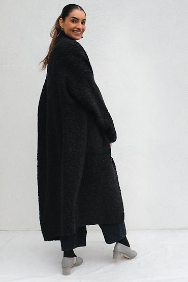 Женское пальто из искусственного меха (тедди), черное, длина миди. - Фасон: свободный, прямой. - Застежка: пуговицы спереди на поясе. - Рукава: длинные, со слегка спущенной линией плеча. - Длина: ...