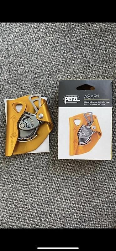 - Страховочное устройство Petzl ASAP (на фото — оригинальная коробка и само устройство). Подходит как мобильный ловитель падения для работы по канату.