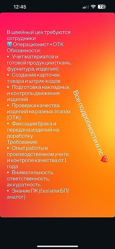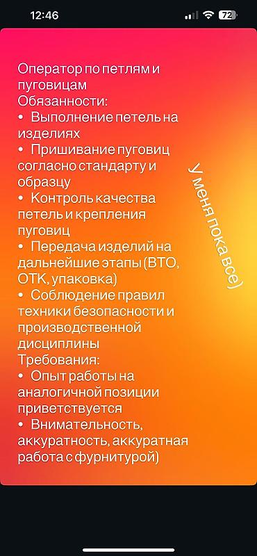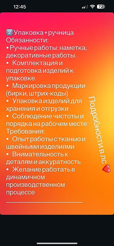 Швейный цехке конвейерный рубашка тигилет: Тигүү цехине 👉 тигүүчүлөр керек 🚨🚨🚨 Тажрыйбасы бар болсо жакшы. Иш туруктуу, шарттар жакшы.🔥🔥 📍 дареги: Магистраль – Баха району 💰 Айлык маянасы суйл...Договорная