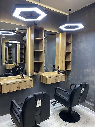 Барбершоп приглашает в команду барберов. Современное рабочее пространство: индивидуальные рабочие места с большими зеркалами, удобные гидравлические кресла, полки для инструментов, яркое потолочное освещение, нейтральные стенды для расходников.