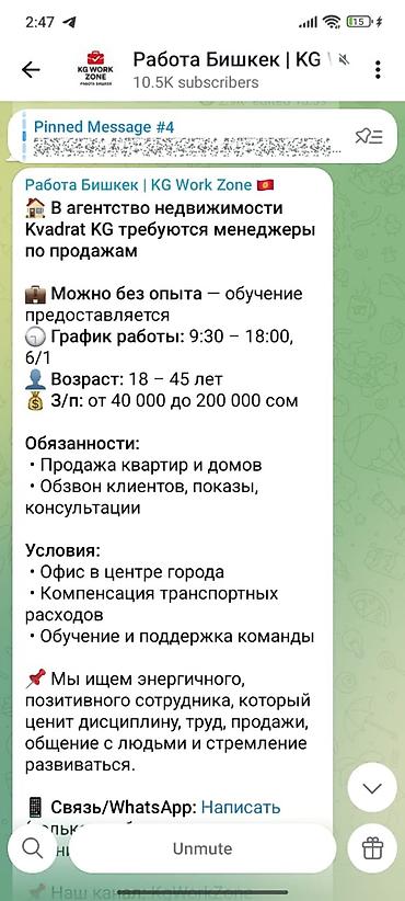- Доход: от 40 000 до 200 000 сом; в объявлении также указано «з/п от 500–3000 долл».