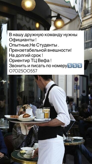Срочно требуется официант с опытом !!! ватсап