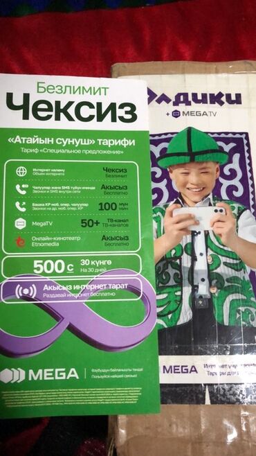 - «Чексиз»: безлимит внутри сети, 100 минут на другие сети КР, более 50 ТВ‑каналов MegaTV, онлайн‑кинотеатр Etnomedia, возможность раздавать интернет. Стоимость: 500 с за 30 дней