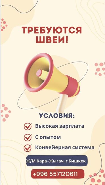 Опытный швеялар керек!!! Опыты жокторду уйротобуз!!! Выходной бар. Машинкалар автомат! Адрес. 12 микр. 20/3. Тел