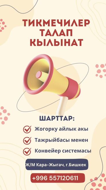 Требуется швеи с опытом и без опыта сами научим ,4нитка,упаковка,чиска работа постаянная очень много зарплата еженедельно детский трико, спортивные костюмы район Нижний Ала Арча,Дордой,Ак тилек,Кел...
