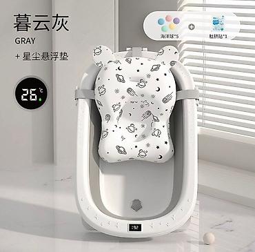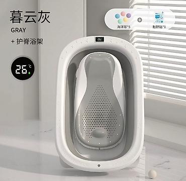 Складная детская ванночка с интегрированным термометром, выполненная в белом и сером цветах. Модель оснащена цифровым дисплеем для отображения температуры воды, что обеспечивает комфорт и безопасно...