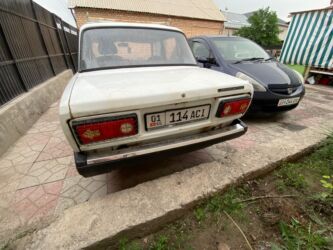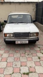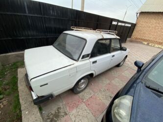 ВАЗ 2107, седан, белый цвет. Классическая «семёрка» с задним приводом, лицензионные номерные знаки KG на авто. Кузов 4‑дверный, металлический багажник на крыше (поперечные дуги и площадка). Бамперы металлические с накладками, прямоугольные передние фары, решётка радиатора фирменного образца. Задние фонари с защитной сеткой. Колёсные диски штампованные, резина стандартного размера. Выхлопная система штатная, зеркала наружные чёрные.