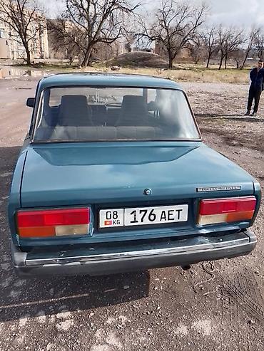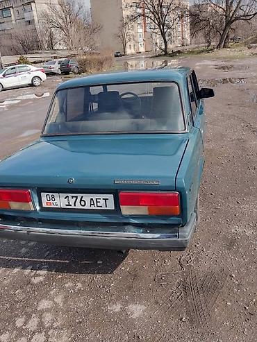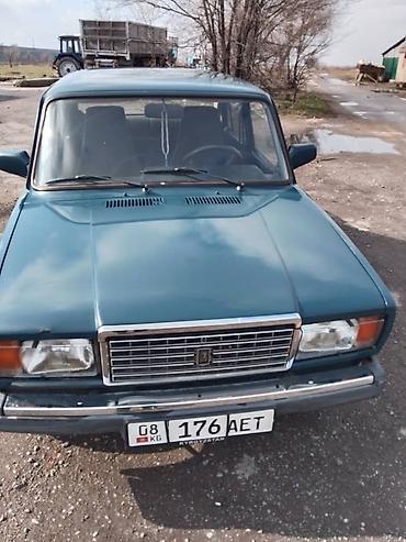 ВАЗ 2107 (Жигули), седан, цвет – темно-зелёный/бирюзовый металлик. Киргизские номера (KG), кузов классической формы с хромированными бамперами и фирменной решеткой. На крыле шильдик “1.6” – бензиновый двигатель 1.6 л. Кузов четырехдверный, тонированные задние стекла, наружные зеркала в цвет кузова, брызговики. Стальные штампованные диски с колпаками, резина универсального рисунка.