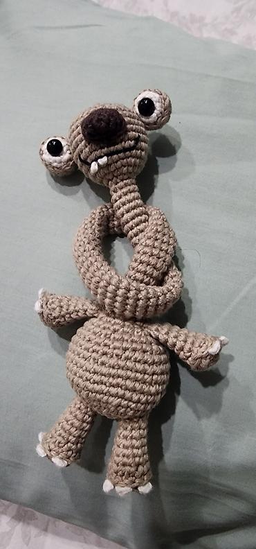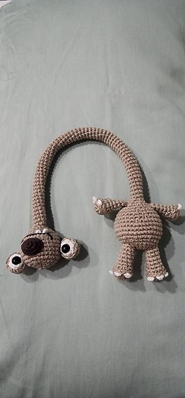 Вязаная игрушка крючком — забавный персонаж с длинной гибкой шеей, большой круглой мордочкой и выразительными глазками. Детали: ушки, лапки с «коготками», объёмное пузико, вышитая улыбка и зубки. Цвет — бежево-коричневый с контрастным тёмным носом и белыми акцентами. Шея мягкая и податливая: её можно завязывать узлом или придавать разные формы — игрушка отлично держит позы, подходит для тактильных игр и фотосессий. Пряжа плотная, фактурная; наполнитель мягкий, равномерный. Примерный размер — средний, удобен для детских рук и декора комнаты. Отличный подарок любителям уникальных хендмейд-игрушек и амігуруми.