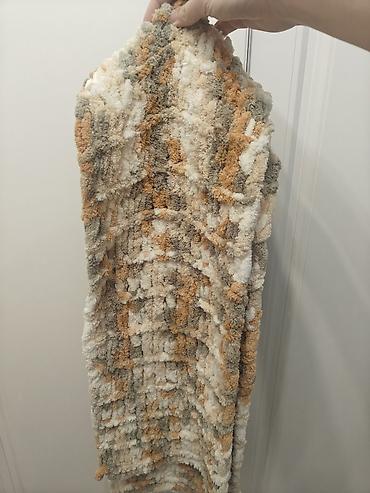 Шарф ручной вязки, длина около 1 метра. Объёмная мягкая пряжа «плюш» с выраженной фактурой. Цветовая палитра: молочно‑белый, бежевый, карамельный и серо‑оливковый, мраморный меланж. Теплый, приятный к коже, не колется. Подходит для повседневной носки и как уютный акцент к верхней одежде. Ширина — средняя, удобен для одно-двух оборотов вокруг шеи. Уход: деликатная стирка в холодной воде, сушка на горизонтальной поверхности.