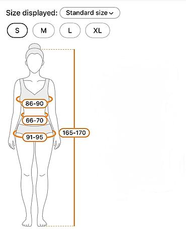 Для размера S ориентиры: ОГ 86–90 см, ОТ 66–70 см, ОБ 91–95 см, рост 165–170 см.