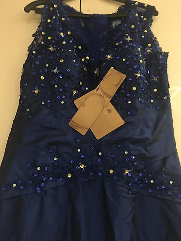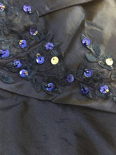 Вечернее платье насыщенного темно‑синего цвета с декоративной отделкой.