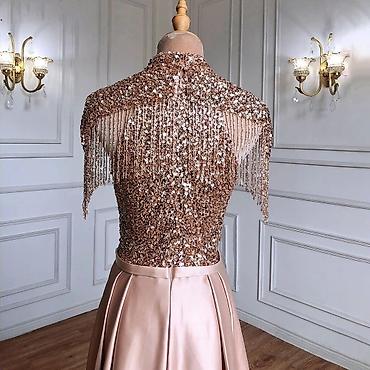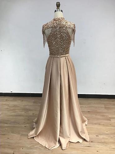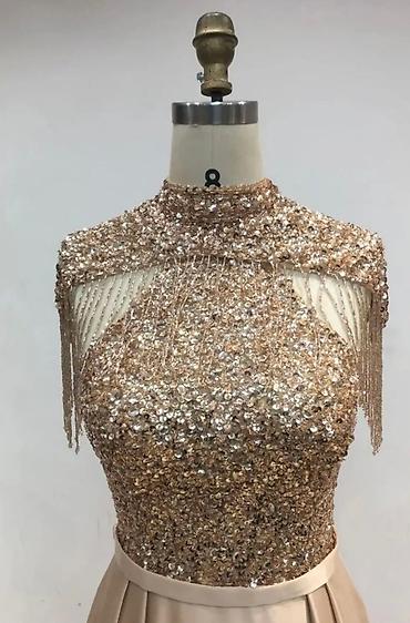 Верх платья украшен сверкающими пайетками, плавно переходящими в элегантный высокий воротник и нежные струящиеся кисти на плечах — они добавляют утончённости и акцентируют внимание на линии плеч. Плавно расклешённая юбка из плотного атласного шелка создает изящный силуэт и легкое движение при каждом шаге.
