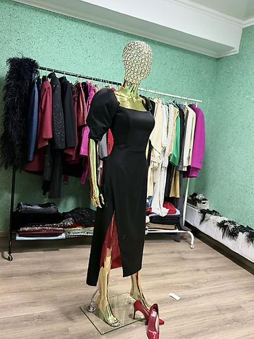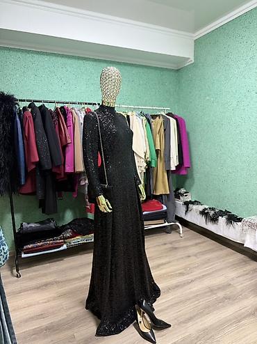 3) Черное платье с высоким воротом и длинными рукавами, целиком покрыто микро-пайетками, создающими глубокий глянец. А-силуэт с плавным расширением к низу.