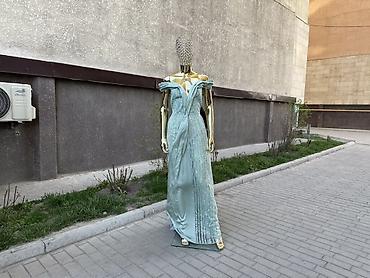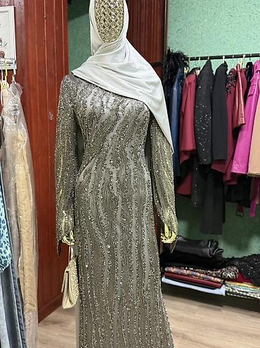 1) Серое платье с закрытым верхом и длинными рукавами, полностью расшито мерцающими бусинами и пайетками в волнообразном рисунке. Аккуратный круглый вырез, мягко подчеркивает талию. Подходит для торжеств и светских мероприятий.