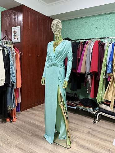 4) Мятное платье с запахом: глубокий V-вырез, драпировка на талии, высокий разрез спереди, эластичная благородно поблескивающая ткань.