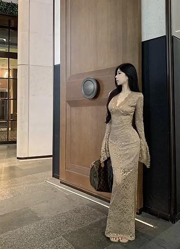 • бежево‑песочное кружевное с V‑образным вырезом и длинными расклёшенными рукавами.