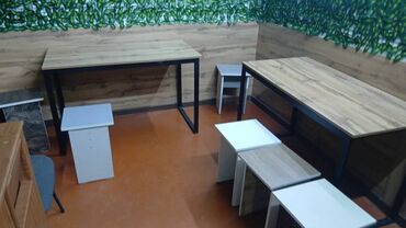 - Гостевая зона на несколько мест: столы из ЛДСП с металлическими опорами, стулья, тумбы/подставки.