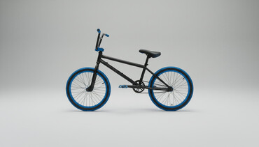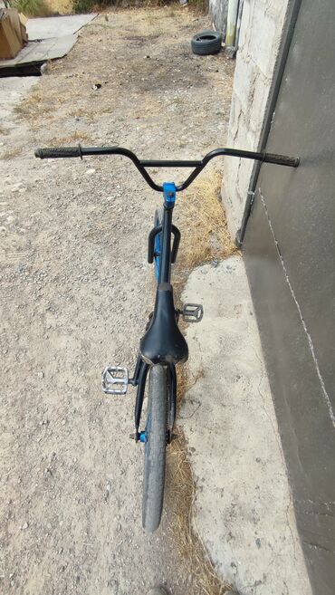 Велосипед BMX с прочной черной рамой и яркими синими колесными дисками. Оснащен широким рулем и удобным сиденьем, что обеспечивает комфорт и маневренность для выполнения трюков и катания в условиях города или на специальных площадках. Надежный выбор для любителей экстремальной езды.