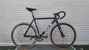 Велосипед с фиксированной передачей черного цвета, предназначенный для городской езды. Оснащен прямым рулем типа "бараньи рога" и имеет раму с минималистичным дизайном. Колеса с тонкими покрышками и высоким профилем обода способствуют легкому и быстрому перемещению. Красные элементы на втулках колес и других деталях добавляют акцент к общему дизайну. Идеально подходит для передвижения по городу, обеспечивая маневренность и скорость.