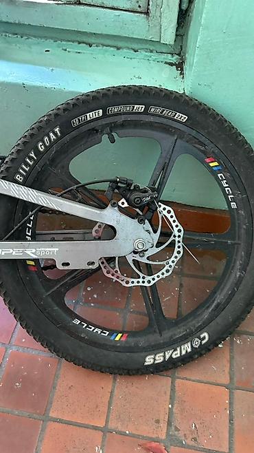 Велосипед с полноразмерной рамой серебристого и бирюзового цвета, оснащенный дисковыми тормозами и амортизационной вилкой. На покрышках имеется маркировка "BILLY GOAT" и "COMPASS", указывающая на тип шин для пересеченной местности. Заднее колесо имеет широкую покрышку с агрессивным протектором, что обеспечивает хорошее сцепление с дорогой. Велосипед подходит для катания по бездорожью и горным тропам.