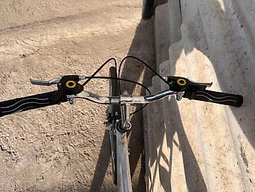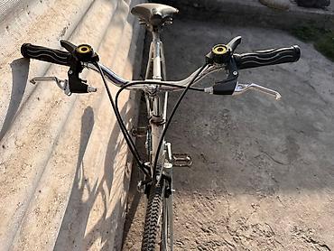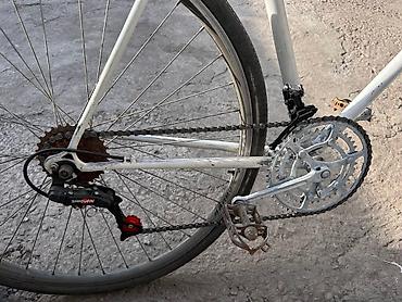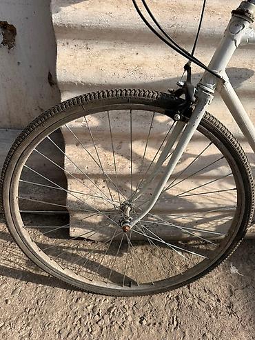 Велосипед в белом цвете с простой конструкцией и минималистичным дизайном. Он оснащен черным сиденьем, прямым рулем с черными рукоятками и двумя ручными тормозами. Одинарная звездочка спереди и натяжитель цепи обеспечивают эффективную передачу крутящего момента. Модель имеет две большие шины с выраженным протектором, подходящие для различных дорожных покрытий, и две педали. Этот велосипед подходит для повседневных поездок по городу или за его пределами.