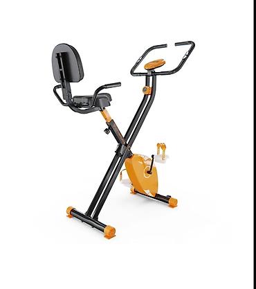 Складной велотренажер X-образной конструкции, выполненный в черном цвете с оранжевыми вставками. Оснащен регулируемым по высоте сиденьем со спинкой и ручками, а также регулируемым рулем. Педали с ремешками для фиксации стопы. Компактный и удобный для занятий спортом в домашних условиях.