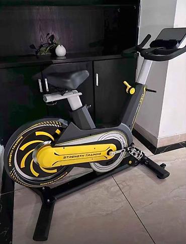 Эргономичный велотренажер в черно-желтом дизайне, предназначенный для тренировок дома или в спортзале. Модель оснащена удобным сиденьем с амортизацией и регулируемым рулем, что обеспечивает комфорт во время длительных занятий. На передней панели руля расположена подставка для планшета или смартфона, позволяющая совмещать тренировки с просмотром контента. Маховик с маркировкой "Strength Training" обеспечивает плавное и эффективное сопротивление для силовых тренировок. Прочная рама гарантирует стабильность и долговечность использования. Транспортировочные колесики на передней части основания упрощают перемещение тренажера. Надежный вариант для поддержания физической формы.