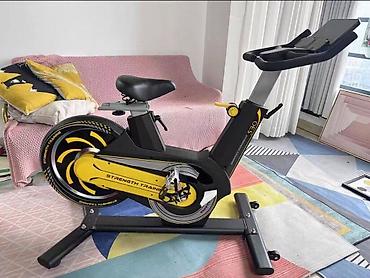 Эргономичный велотренажер черного цвета с яркими желтыми акцентами, предназначенный для домашних тренировок. Оборудован регулируемым сиденьем и рулем для комфортной посадки. На рулевой стойке предусмотрена подставка для планшета или смартфона, что позволяет просматривать контент во время занятий. Маховик с надписью "Strength Training" обеспечивает плавное и эффективное сопротивление, делая его идеальным для кардиотренировок и развития выносливости. Подходит для установки в жилых помещениях, обеспечивая удобство и эффективность занятий спортом дома.