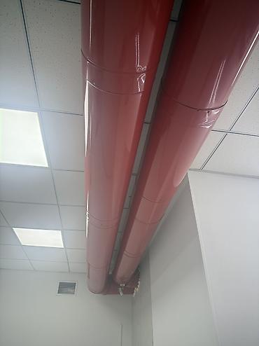- Круглые воздуховоды из металла с глянцевым красным покрытием.