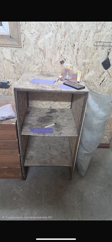 - Дополнительно компактная тумба из ОСБ с двумя полками — подходит как приставной модуль или отдельный органайзер для расходных материалов, шлифкругов, бутылок с химией и т. п.