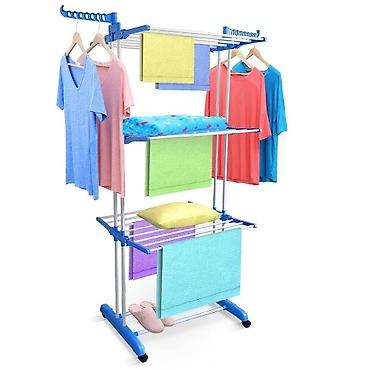 Удобная в использовании, вешалка Three Layers Cloth Rack выполнена в виде вертикальной складной устойчивой конструкции на четырех колесиках. Благодаря этому, вы легко можете перемещать ее и компактно хранить в помещении. Цветовая гамма вешалки — бело-синяя — поможет ей ненавязчиво вписаться в любой интерьер.