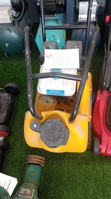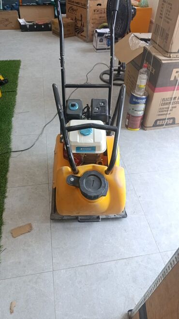Вибрационная плита оранжевого цвета, оснащенная двигателем внутреннего сгорания. Предназначена для уплотнения различных типов грунта, песка, гравия и асфальта. Имеет прочную раму и удобные ручки для управления. Подходит для строительных и дорожных работ, а также для ландшафтного дизайна.