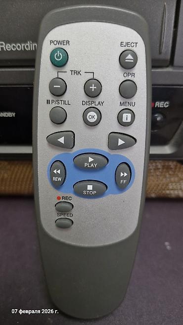 - Пульт ДУ с кнопками POWER, EJECT, PLAY, STOP, REW/FF, REC, SPEED, трекинг ±, пауза/кадр, меню, дисплей/OK.