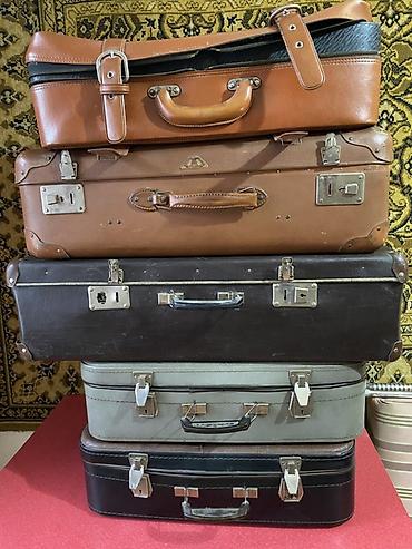 - Набор чемоданов 5 шт.: разные размеры, материалы — кожа/винил и картон с кожзамом. Классическая фурнитура на металлических замках и защёлках, ручки из кожи/пластика, ремни на пряжках. Цвета: коричневые, чёрные, серый. Отлично подойдут для интерьера, витрин, фотосессий и хранения.