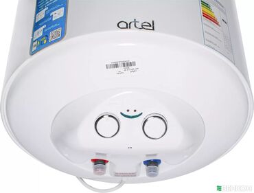 Белый электрический водонагреватель Artel с цилиндрическим корпусом, предназначенный для бытового использования. Оборудован механическим регулятором температуры и индикатором нагрева. Подходит для ...