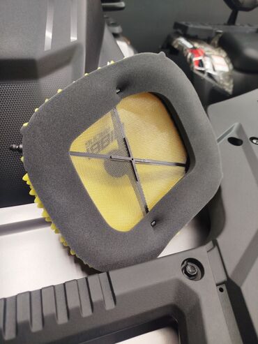 - Конструкция: двухступенчатая фильтрация. Снаружи — яркий жёлтый съёмный префильтр с шипованной поверхностью для задержки крупной пыли и снега; внутри — тонкая металлическая сетка и фильтрующий элемент из пористой пены.