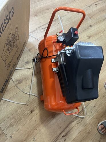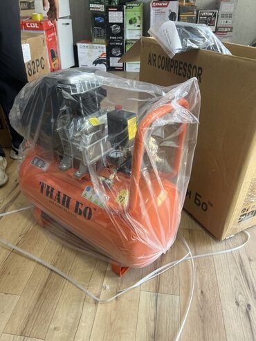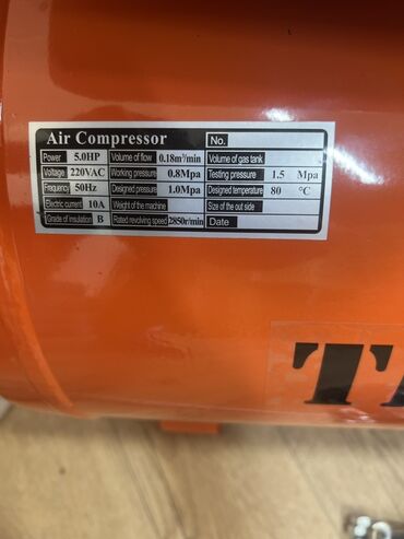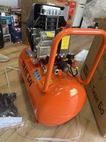 Поршневой воздушный компрессор 50л ТИАН БО оранжевого цвета с горизонтальным ресивером. Компрессор оснащен двигателем мощностью 5.0 л.с., обеспечивающим производительность 0.18 м³/мин. Рабочее давление составляет 0.8 МПа, а максимальное испытательное давление — 1.5 МПа. Предназначен для различных задач, требующих сжатого воздуха, таких как подкачка шин, использование пневматических инструментов и покрасочные работы. Удобная ручка и колеса (не видны, но подразумеваются для такого типа компрессора) обеспечивают легкость перемещения.