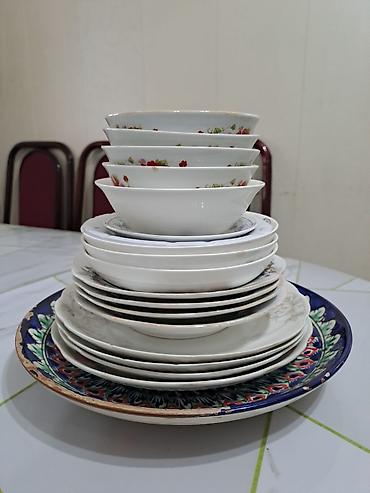 Посуда Кесе 20 шт Пиала 20 шт Чайник 1 шт Пловница 10 шт Беш бармак 10 шт Тарелка 9 см -20 шт Тарелка 8 см - 20 шт Конфетница - 2 шт Салатница - 2 шт стоимость набора 35 000 сом