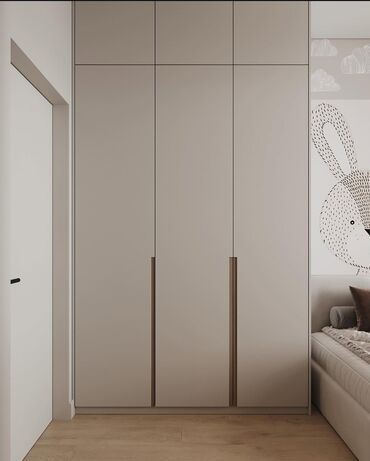 - Отделка: сочетание теплого светлого дерева и матовых фасадов в нейтральных тонах; вариант в пудрово-розовой гамме с текстильными панелями. Вертикальные рейки/ламели на стене, декоративные панели.