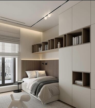 - Планировка: решения для оконной стены, угловые конфигурации, размещение рядом с кроватью с верхними полками по всей длине.