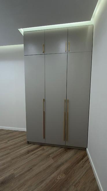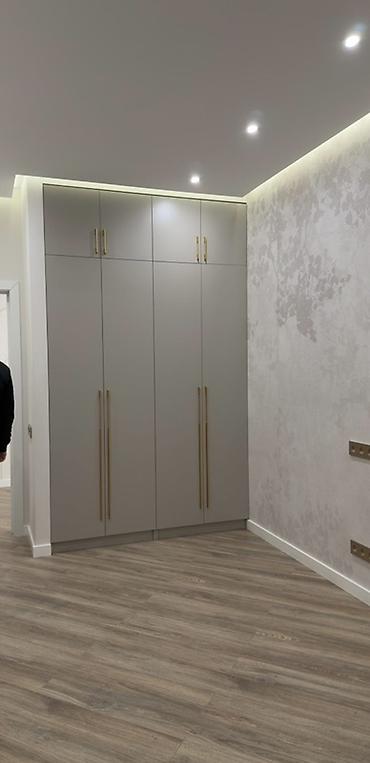 - Вместительная организация хранения: высокий модуль от пола до потолка — подходит для одежды на вешалах, полок для трикотажа, коробов и сезонных вещей.