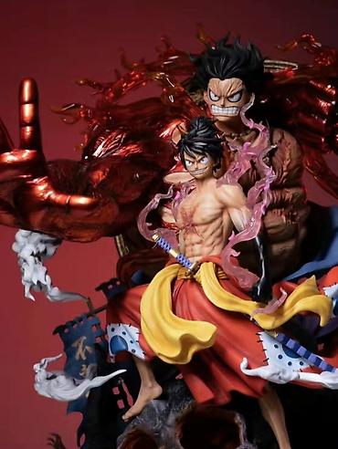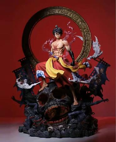 Высокая детализация: фигурка изображает мускулистого персонажа в динамичной позе, с оголенным торсом и яркими элементами одежды. Красные штаны с желтым поясом, мистическая дымка вокруг и разрушенные элементы в основании создают эпическую сцену.