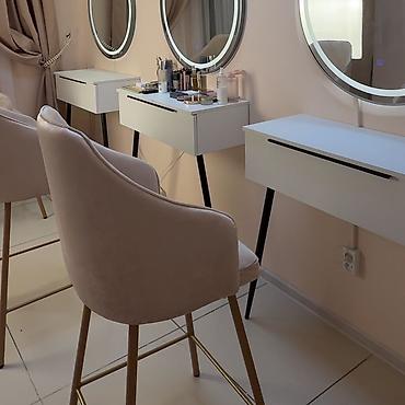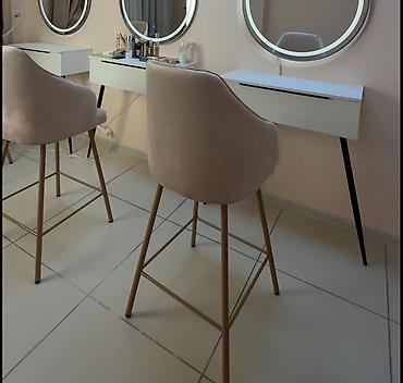 - Стулья полубарные, на высокой деревянной/металлической базе с перекладинами-подножками. Мягкое велюровое сиденье с плавными подлокотниками и высокой спинкой, оттенок — нежный пудрово-бежевый. Устойчивая конструкция, комфортная посадка для длительных процедур.
