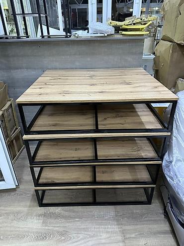 - Конструкция: прочный металлический каркас из профиля черного цвета + облицовка/плита под дерево (ЛДСП).