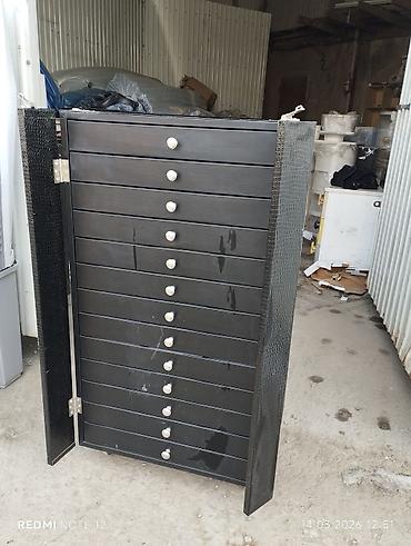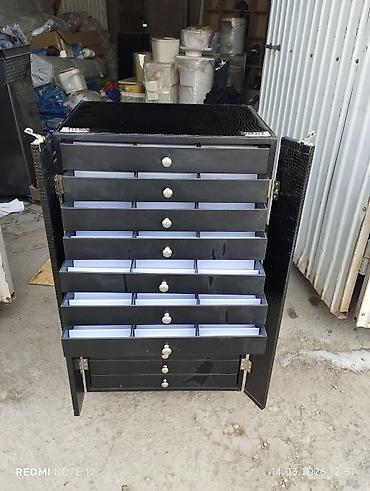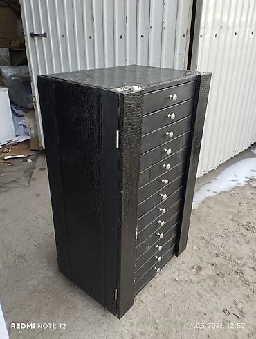 - Вместительность: множество узких выдвижных ящиков по всей высоте шкафа; на фото видно несколько ящиков с разделителями и нижний глубокий отсек.