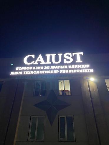Объемная вывеска "CAIUST" с подсветкой, установленная на фасаде здания, предназначенная для обозначения Центрально-Азиатского Международного Университета Наук и Технологий. Буквы белого цвета, четкие и хорошо читаемые как днем, так и ночью благодаря внутренней подсветке. Ниже расположена надпись на казахском языке, дублирующая название университета. Идеально подходит для идентификации крупных учреждений и улучшения их видимости.