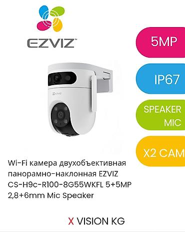 - Двухобъективная панорамно‑наклонная EZVIZ CS‑H9C‑R100‑8G55WKFL: 5+5 Мп, объективы 2.8 мм и 6 мм, микрофон и динамик, защита IP67.