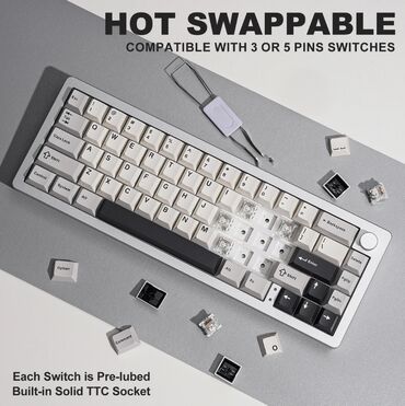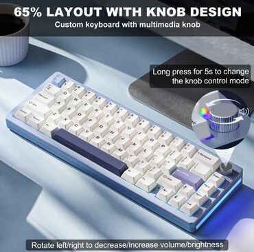 Клавиатура выполнена в 65%-ной раскладке, включающей 66 клавиш и одну универсальную металлическую ручку. Несмотря на компактность, устройство сохраняет доступ к функциональным клавишам, стрелкам и цифровым кнопкам. Многофункциональная ручка позволяет легко регулировать яркость подсветки, переключать режимы RGB и управлять громкостью, что делает устройство незаменимым как для работы, так и для развлечений.