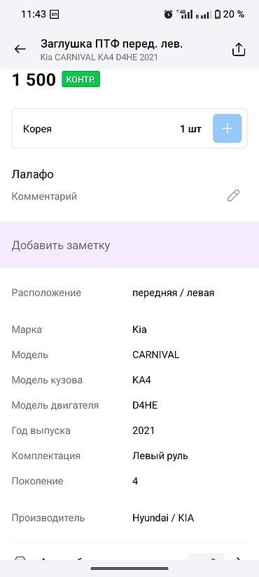 Подходит для Kia Carnival KA4 (2021+, левый руль). Отличное решение для восстановления внешнего вида бампера при утрате или замене рамки ПТФ.